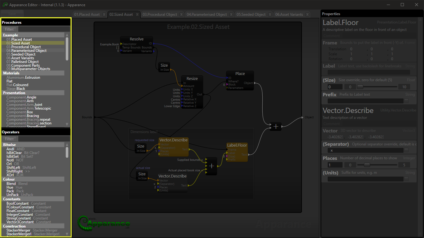 Much like the operators in a programming language, or the functions in a utility library, these are what you use to compose more complex pieces of logic and the systems you design to perform the high level goals you have for the procedural objects in your world. These are built into Apparance and can't be changed. They are found in the Operators panel of the Editor.