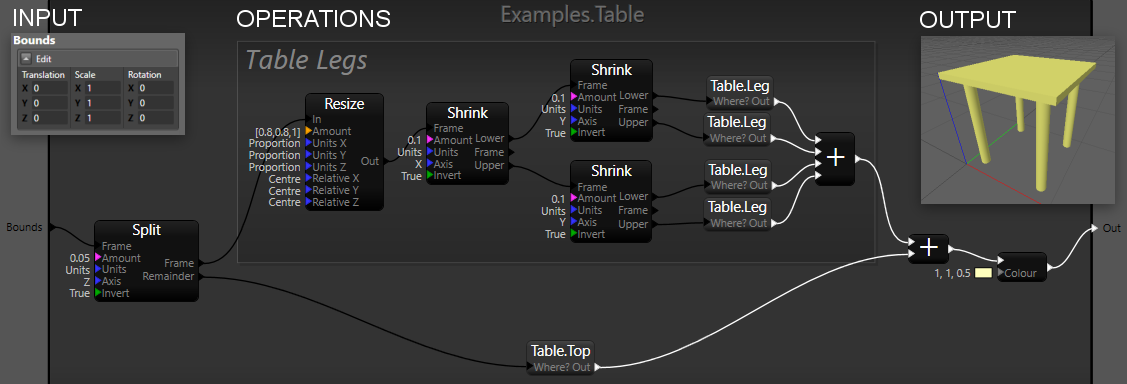 During the synthesis process, operator generated geometry (and object placement) is accumulated in the synthesis buffer. The Model Segment (white connection points) data type is a reference to where in the buffer this geometry has been created. Passing this around allows specific pieces to be referred to and have further processing operations applied (see below). A specialMerge