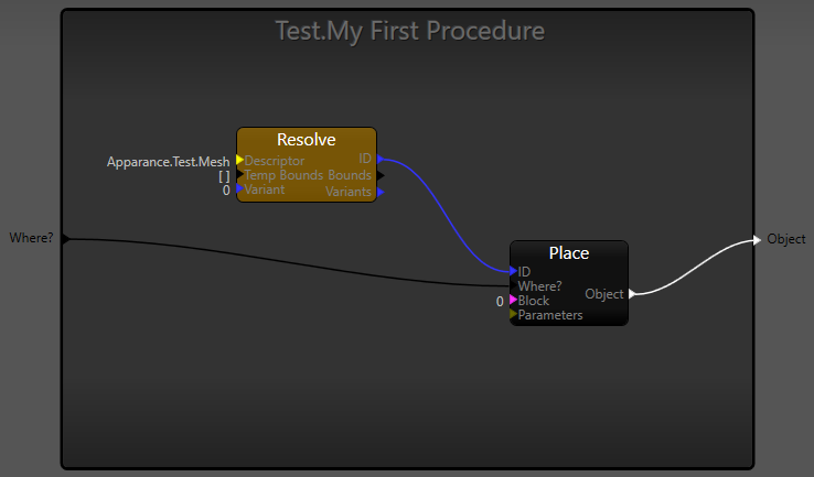 - Drag a wire from the Object output of the Place operator to just outside the right of the procedure outline (to create an output)Drag connections outside the procedure to create inputs & outputs
