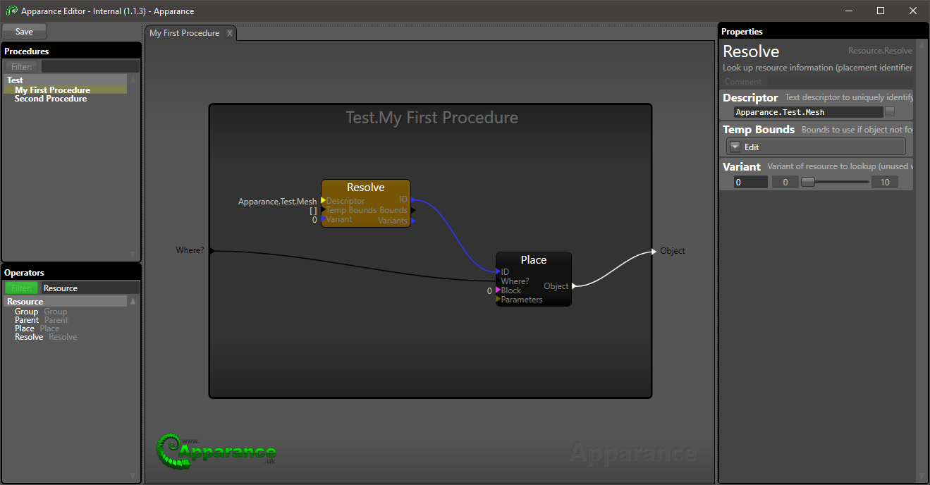 - Select the Resolve operator and set the Descriptor to "Apparance.Test.Mesh"