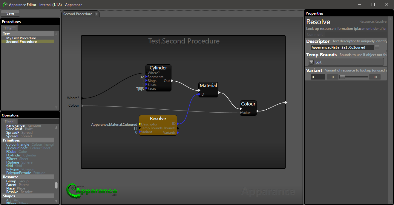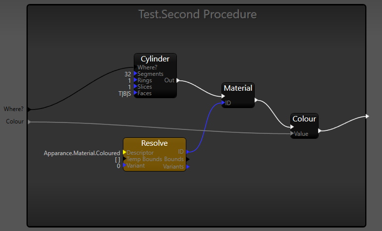 - Set the Resolve nodes Descriptor to "Apparance.Material.Coloured"